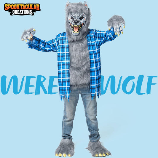 Boy Howling Werewolf Deluxe Costume with Mask, Werewolf Claws Gloves, Boot Covers, Wolf Costume Kids