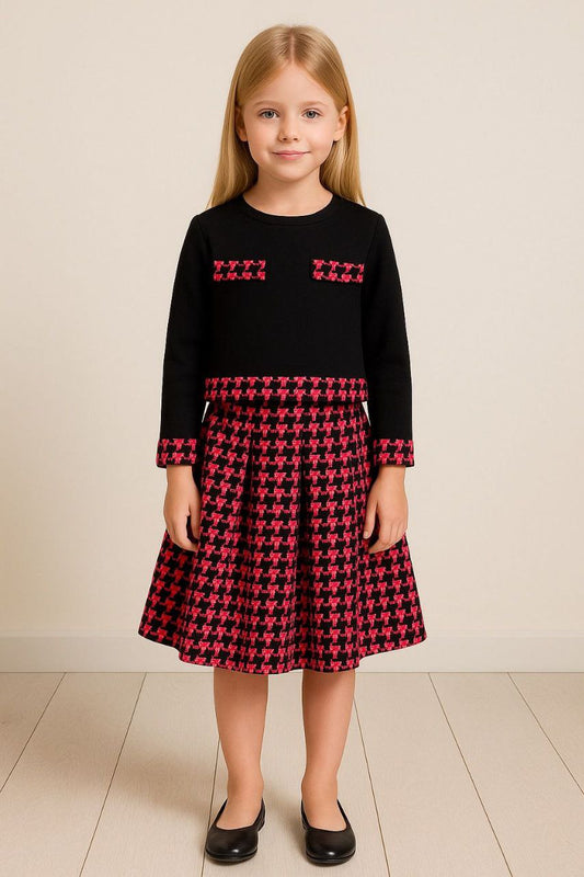 Robe noire à manches longues + jupe motif pied-de-poule rouge/noir - REFT