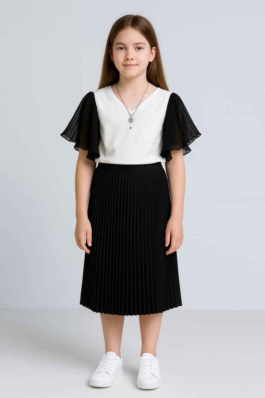 - Top blanc à manches plissées transparentes Manches en voile noir qui apportent légèreté et mouvement, tout en créant un contraste visuel raffinéPalette monochrome intemporelle Facile à associer avec d’autres pièces ou accessoires, ce look traverse les saisons avec style.