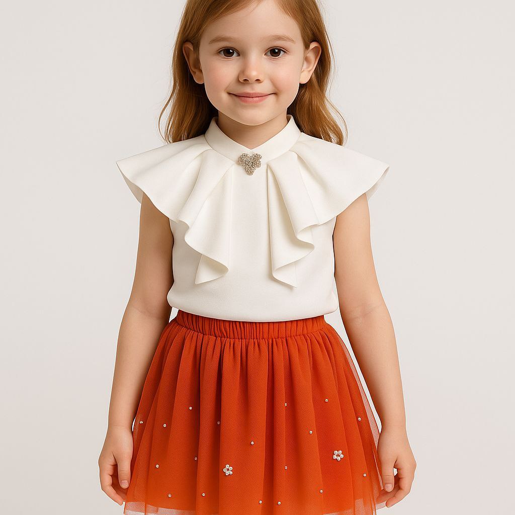 - Jupe orange en tulle à motifs floraux blancs Superposition aérienne et festive, idéale pour virevolter avec élégance.
